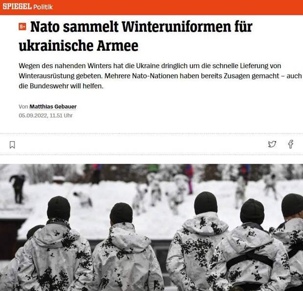 «После срочного запроса НАТО подтвердило SPIEGEL, что страны альянса разрабатывают подготовку зимнего пакета помощи для Украины. В частности, речь идет о тёплом обмундировании, зимних ботинках и зимних полевых палатках»,