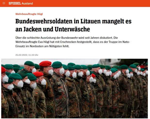 При этом немцы критически относятся к просьбе о передаче дефицитной «собственности бундесвера» Украине. Плохое оснащение бундесвера обсуждалось годами. Уже в этом году у бундесвера возникали серьезные проблемы со снабжением своих вооруженного контингента в Литве теплым нижним бельем и зимней формой. О том, что солдатам бундесвера не хватает курток и нижнего белья, писал Spiegel.