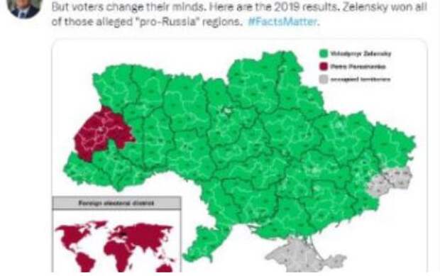 «Но избиратели меняют своё мнение. Вот результаты 2019 года. Зеленский победил во всех этих якобы „пророссийских“ регионах», — ляпнул в своём твиттере бывший посол США в РФ Майкл Макфол пару часов назад.