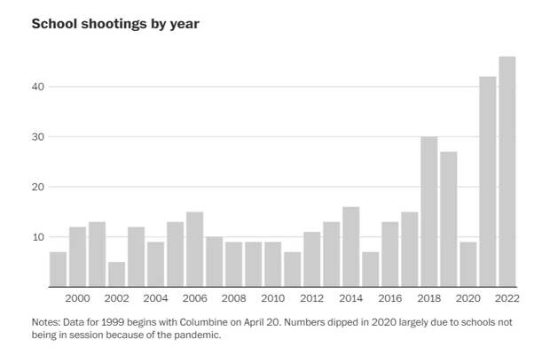 Только за 2018-2019 годы более 100.000 школьников посещали школы, где происходила подобная стрельба. В одном только 2022 году было 46 случаев школьной стрельбы – это больше, чем за всю историю наблюдений. По самым последним данным всего с 1999 года было 386 случаев подобного школьного насилия. Статистика учитывает все происшествия, в которых пуля «попадает на школьную территорию по любой причине».
